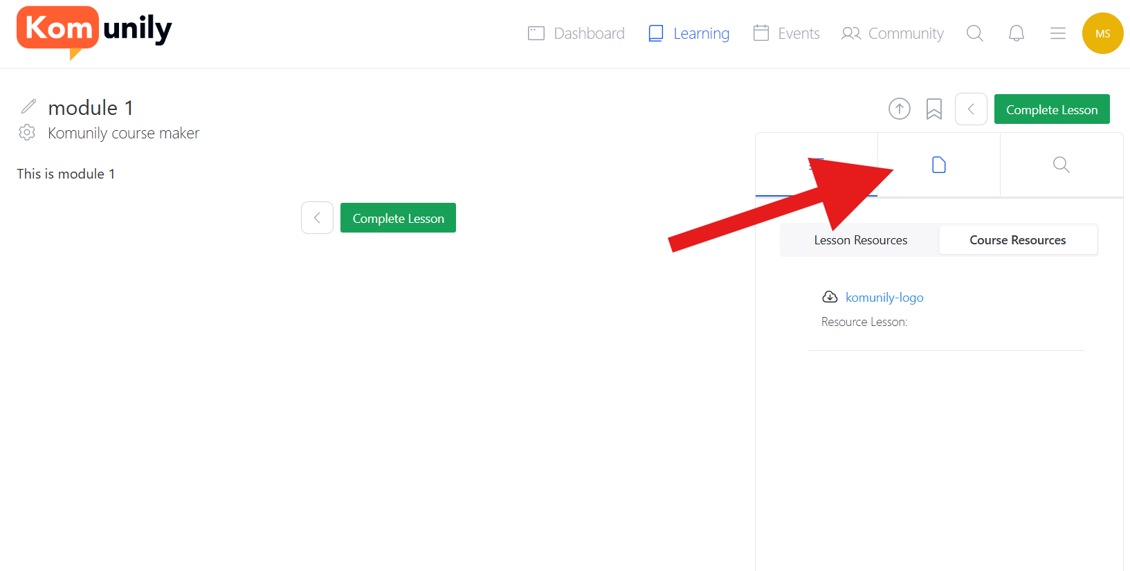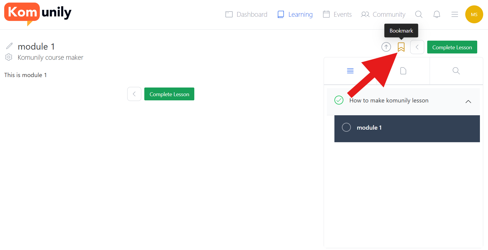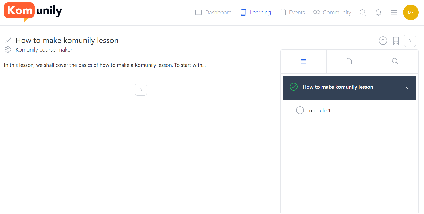 This article details how to navigate the lessons that you are doing on Komunily. In this article, we will be using a simple lesson that was made for the Creating Courses article. Firstly, you can find all your lessons and filter them to find specific ones in the learning section. For more on this, check the learning page article. Once you have found your lesson of choice, select it, and it should, at a basic level, look similar to the image shown below.