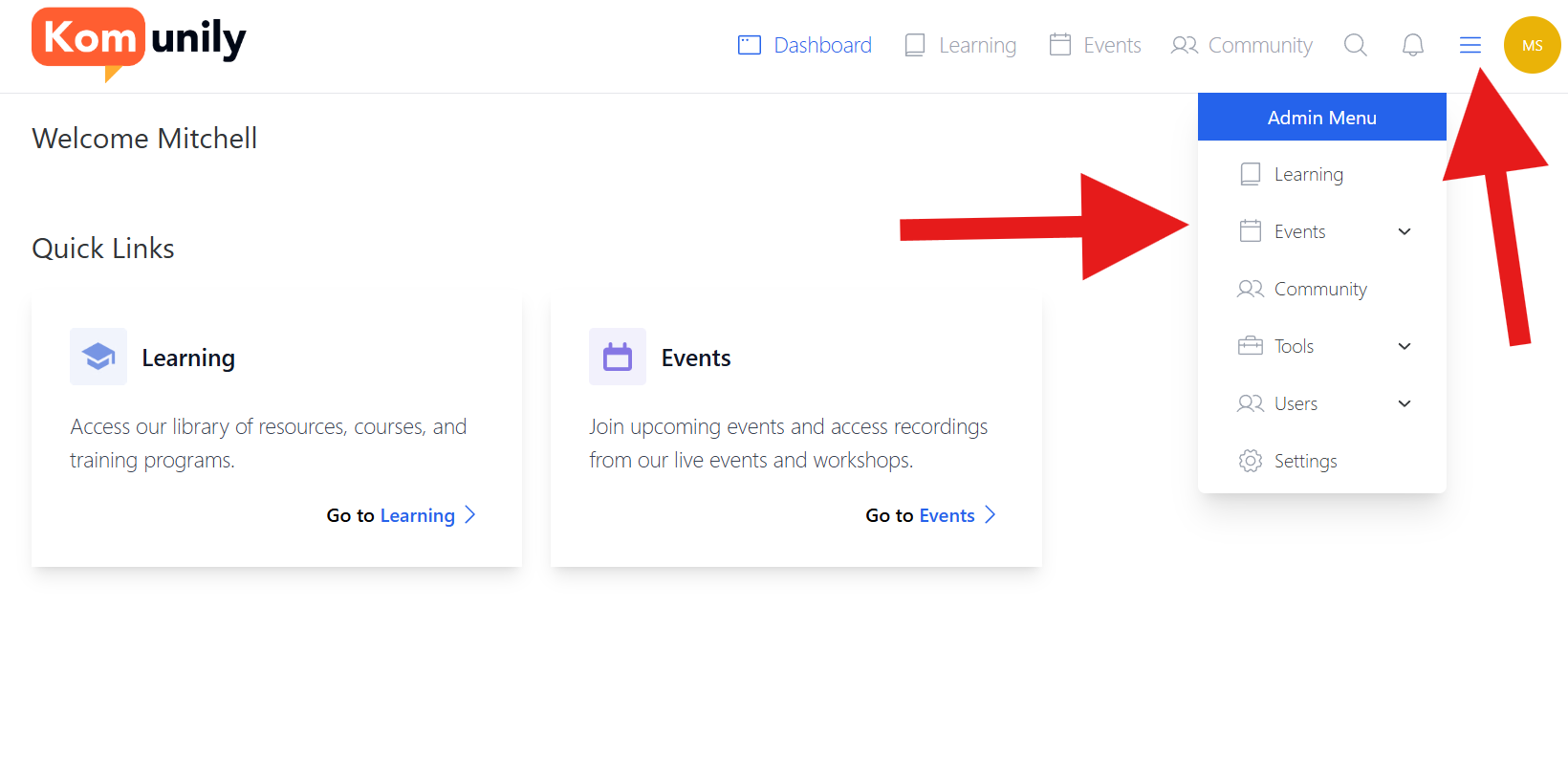 This page details the events admin page and what can be found on it. If you wish to create an event, check the Creating an Event article. To access the events admin page, you can click the 3 lines to bring up the admin menu and then events as shown in the image below.