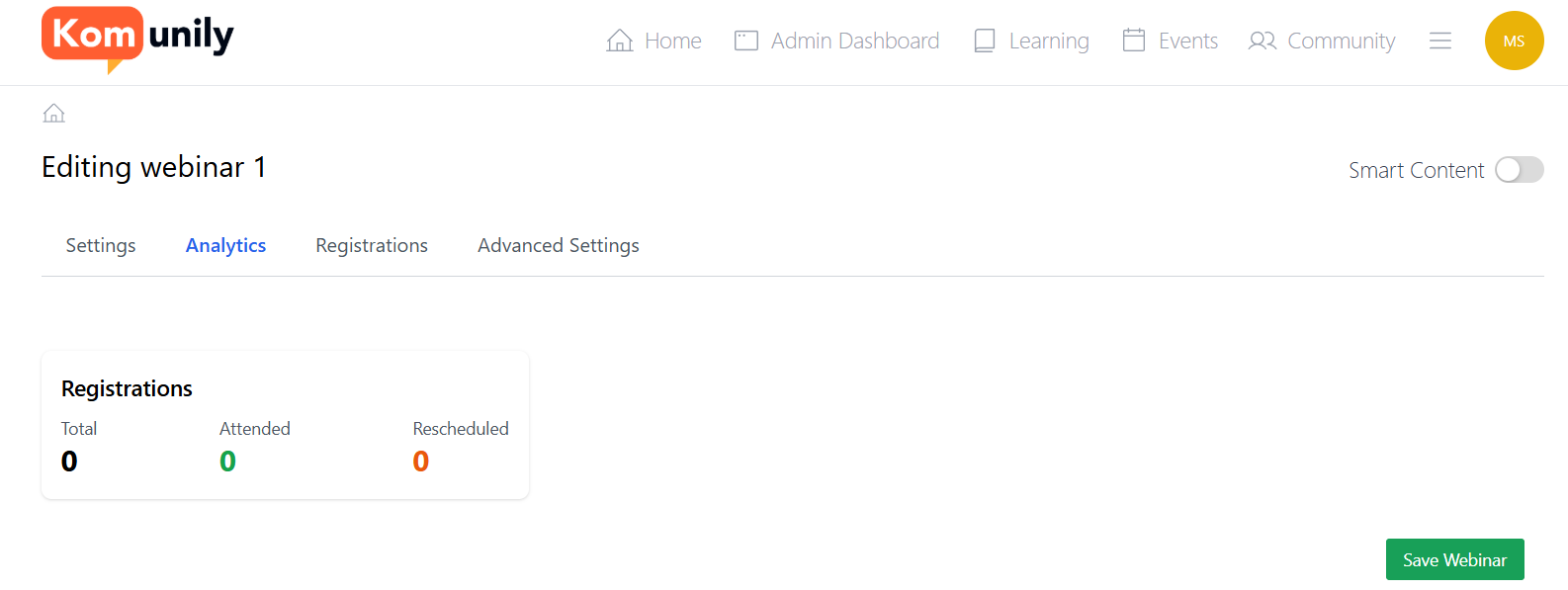 Once you have set up your webinar, you should check both the analytics tab and the registrations tab. The analytics tab shows the total who registered for the webinar, those who attended and those who rescheduled, as shown in the image below. Whereas the registrations tab shows all those who signed up for the webinar.