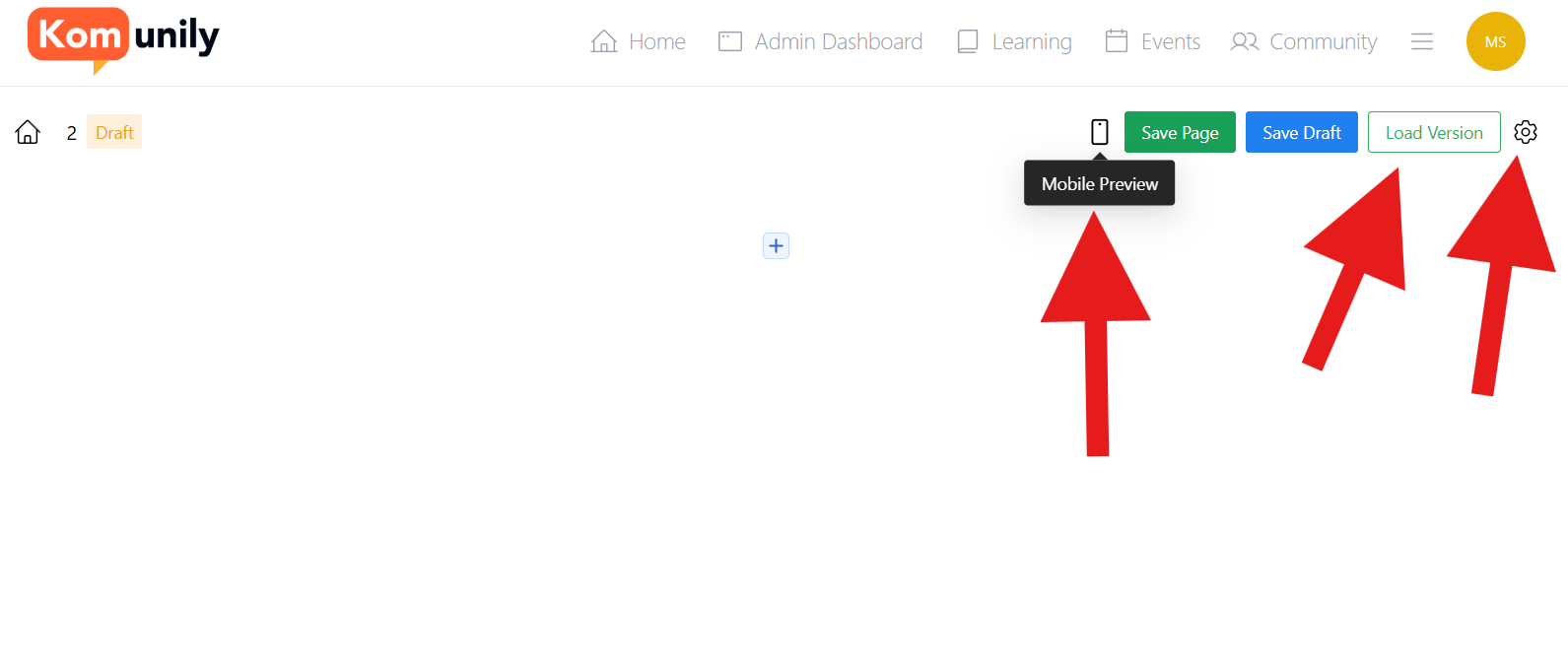Once you select your type, you will be prompted to choose a name for your page, and then we can get to the building. Your page should look like the image below. There are a few notable features on this page before we get into the page building. Firstly, there’s a mobile view so that you can see how your created page would look on typical phones. Secondly, there’s a Load Version button which allows you to select older versions of pages before or after changes, allowing you to hold several ideas until you find the right one. Lastly is the page settings, in here you can add CSS styling, and change the name of the page and the page status.