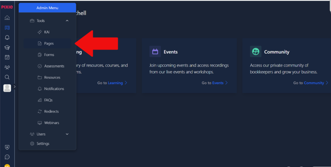 To access the page builder, click on the admin menu and under tools and select pages. This is shown in the image below.