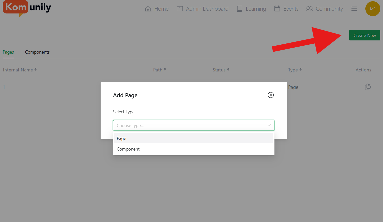 From there, select the Create new option shown in the background of the image below, and then you shall have the choice of creating a component or a page. A component is a reusable section of a page for the page builder.